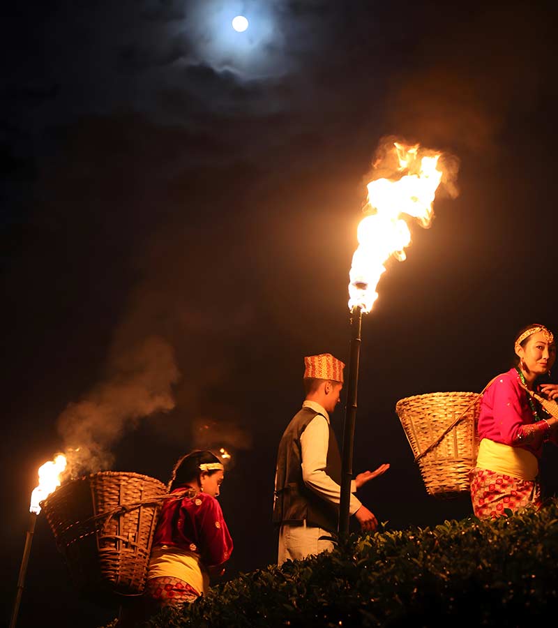 Each year, Okayti Tea Estate proudly hosts the mesmerizing Moonlight Tea Plucking ceremony, a time-honored tradition deeply embedded in the estate’s rich heritage. This extraordinary practice unfolds under the serene glow of the full moon, transforming the lush tea gardens into a dreamlike landscape bathed in silver light. The gentle rustling of leaves, the soft chirping of nocturnal creatures, and the distant hum of the mountain breeze creates a magical atmosphere, making this event not just a harvest but a poetic experience.